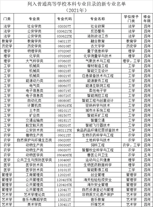 2021年3月1日,教育部公布了2020年度普通高等学校本科专业备案和审批结果的通知。根据高等学校专业设置与教学指导委员会评议结果,确定了同意设置的国家控制布点专业和尚未列入专业目录的新专业名单,融合教育、古文字学、量子信息科学、能源互联网工程、智慧交通、智能飞行器技术等37个新专业列入普通高等学校本科专业目录。