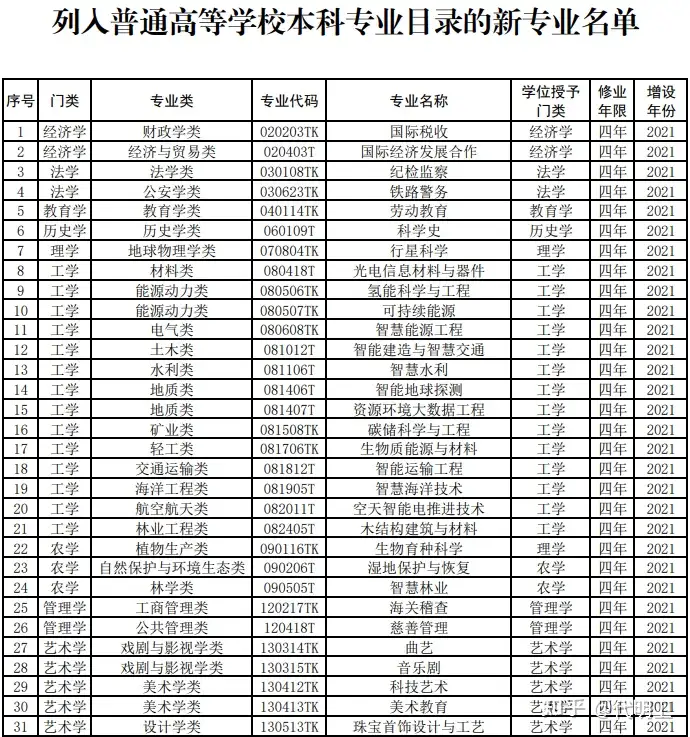 前段时间,教育部发布了《2021年度普通高等学校本科专业备案和审批结果》。本科专业目录新增31个,由去年的740个专业变为771个。