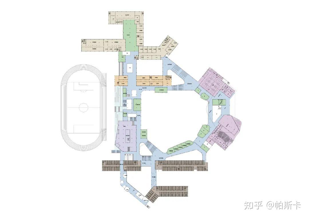 于是我们将东侧广场作为学校入口和公共共享空间,作为设计的主要轴线,以此组织各节点与核心空间并联系各功能区,将各具特色的庭院空间、运动空间与教学空间联为一体,既创造了场所精神又使总图功能布局协调有序。这样的开放空间启示了文化共享性、多元化培养和创意拓展学习的模式,创造出现代职业高中的特色学校。