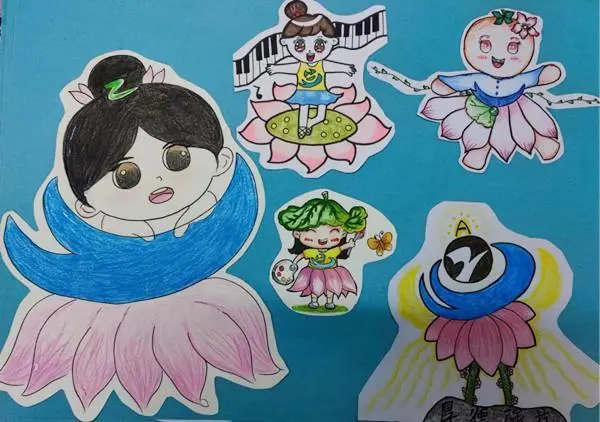 学校池塘里种植的荷花摇曳生姿,让同学们印象深刻。这组吉祥物的灵感就来自于此。荷花花瓣做裙子,样式是锦鲤的鱼尾,意味着学校越来越好。