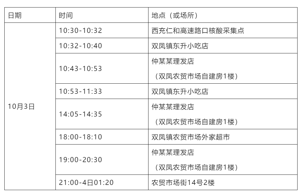 因疫情防控排查需要,为了您和他人的健康,请广大市民朋友对照查看, 如与以下活动轨迹有重叠的市民立即向社区和单位(或居住的酒店)报备,三天内接受三次核酸检测(间隔24小时),在三次核酸结果未报阴性前,严格居家,除两点一线核酸外,不外出、不聚集。感谢您的配合!