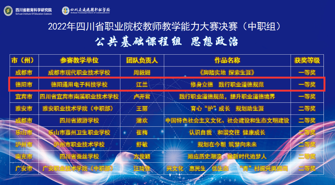 德阳通用电子科技学校共派出6支教师队伍参加本次比赛,其中4支队伍冲进最后决赛并分别荣获2个省一等奖,2个省二等奖。