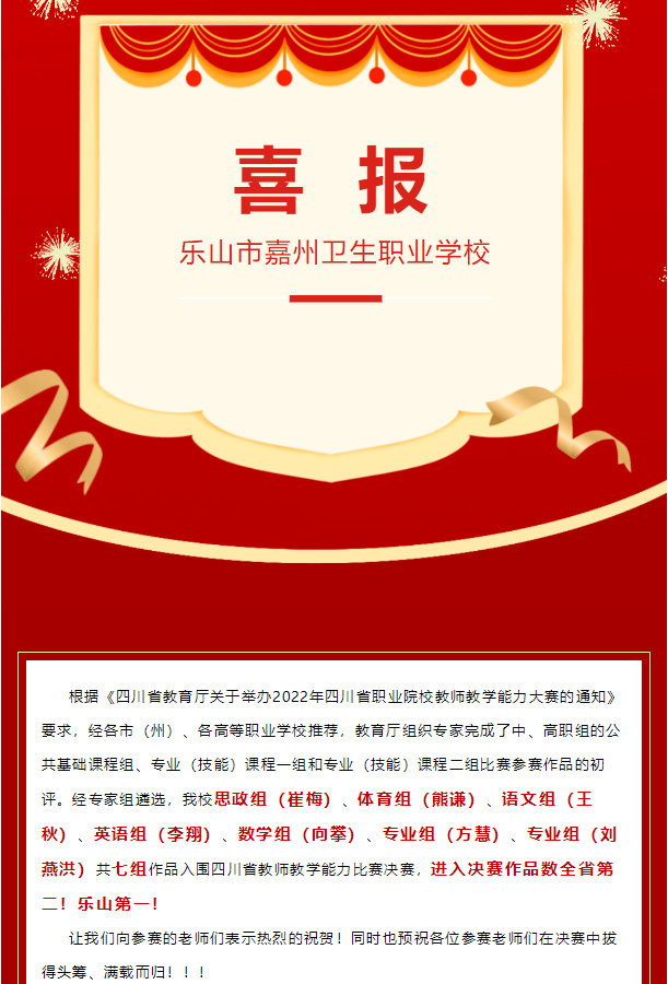 经专家组遴选,乐山市嘉州卫生职业学校思政组(崔梅)、体育组(熊谦)、语文组(王秋)、英语组(李翔)、数学组(向攀)、专业组(方慧)、专业组(刘燕洪)共七组作品入围四川省教师教学能力比赛决赛,进入决赛作品数全省第二!乐山第一!