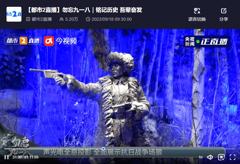 在直播中还用声光电全息投影的方式全面展示了抗日战争的场景,通过声景图的还原方式让我们铭记那场苦难,缅怀先烈,致敬那场不屈的抗争——勿忘国耻,吾辈自强。