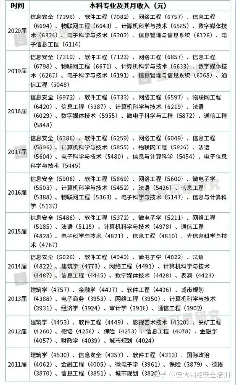 信息安全专业连续7年薪资最高。从上面的大学生近十年就业数据中可以看出,自2014年开始,信息安全反超建筑学成为薪资最高的专业。