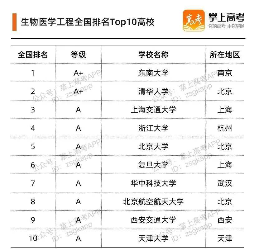 在2021年软科中国大学专业排名榜单中,共有68所院校的生物医学工程专业上榜。Top 10 院校排名如下: