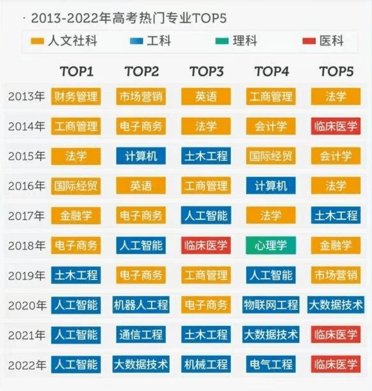 日前,中国教育在线联合百度发布《2022高考大数据》,洞察今年高考动向,盘点十年高考变迁,并列出了十大热搜专业。