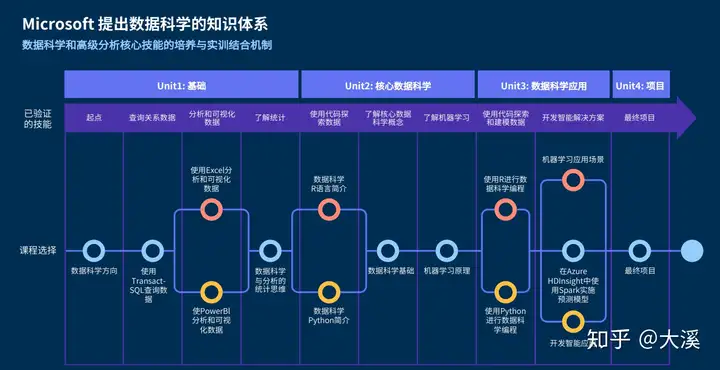 下面是Microsoft提出的数据科学知识体系,涵盖了基础、核心数据科学、数据科学应用、项目四块。从理论到实战循序渐进,相互结合。