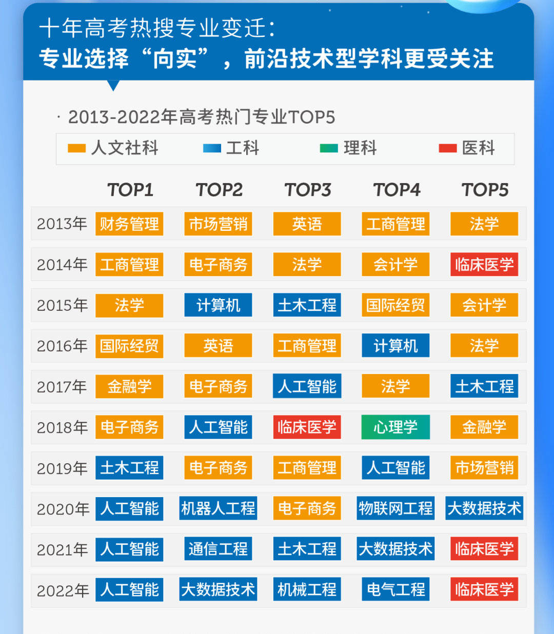根据百度热搜2022高考大数据,今年排名前五的热门专业依次为:人工智能、大数据技术、机械工程、电气工程、临床医学,前四名都是前沿技术型工科专业。