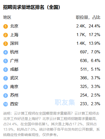 据职友集云计算工程师岗位招聘数量统计,目前市场对于云计算工程师需求超8.5k,北京、上海、深圳招聘需求占前三。行业平均薪资在20k—30k的范围,相较2021年增长了19%,可见对于云计算的人才缺口大,供不应求。