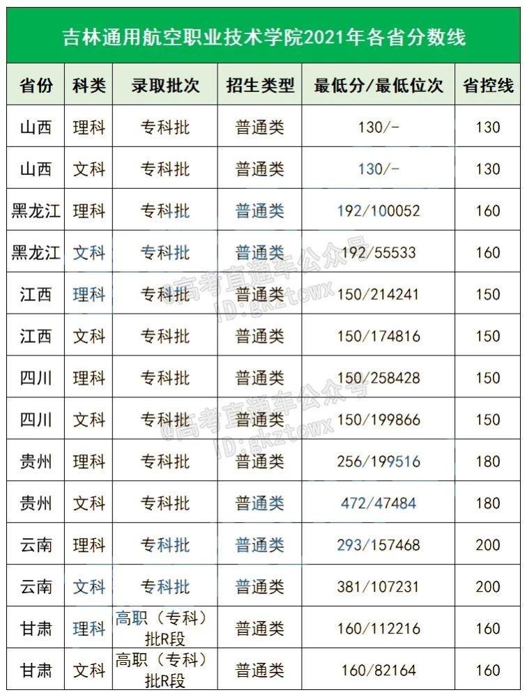 吉林通用航空职业技术学校2021年各省分数线:
