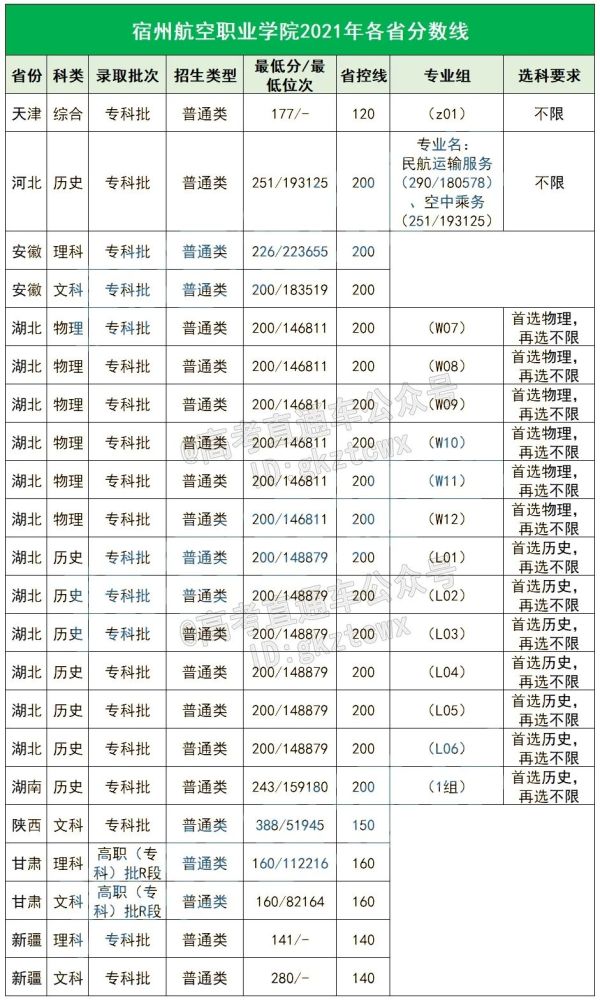 宿州航空职业学校2021年各省分数线: