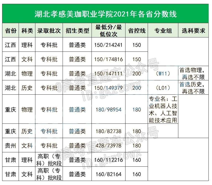 湖北孝感美珈职业学校2021年各省分数线: