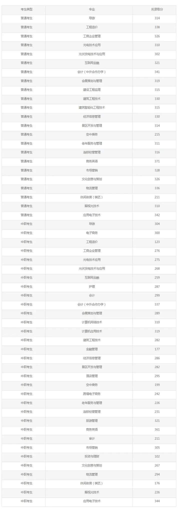 2:特长单招考生:普高类79分,中职类101分,考生在文化总分达到以上最低控制线后方再依招生计划和考生总成绩从高到低依次投档录取。我院2020年各专业拟录取最低成绩如下: