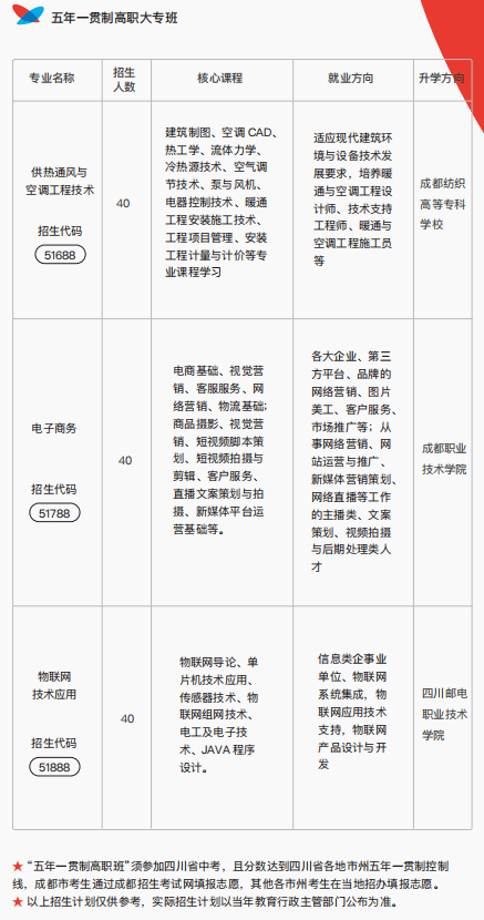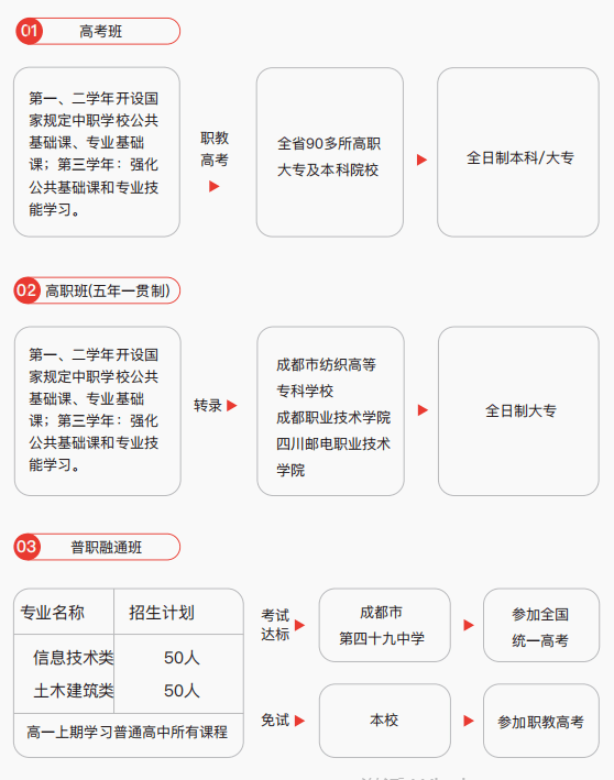 学校坚持升学与就业并重,先后与四川建筑职业技术学校、四川邮电职业技术学校、成都纺织高等专科学校、 四川工程职业技术学校、四川交通职业技术学校、四川水利职业技术学校、成都职业技术学校、成都航空职业技术学校、成都工贸职业技术学校等多家高职院校建立合作关系,打通了五年一贯制、高职单招、职普融通、艺术高考、职教高考等多种升学途径,为每一名学子圆梦大学提供更多渠道!