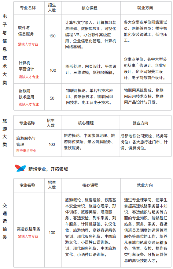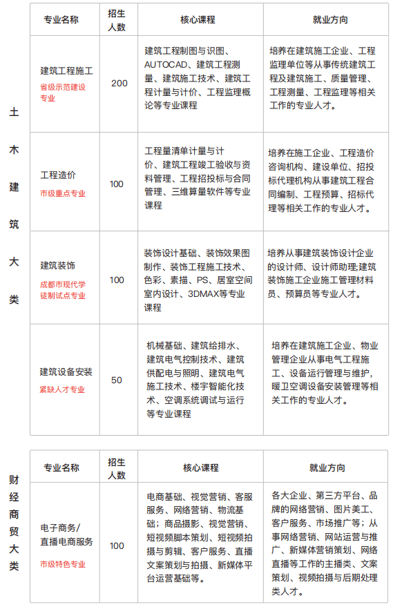 成都职业技术学校开设土木建筑大类、财经商贸大类、电子与信息技术大类、旅游大类、交通运输类共13个专业,专业门类全覆盖。戳视频了解↓↓↓