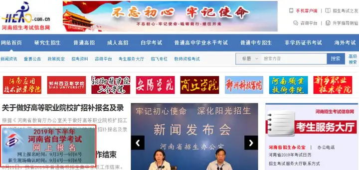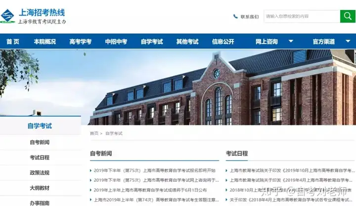 点击首页“考试报名”栏目进入“上海市2019年上半年高等教育自学考试报名”进行准考证与座位号信息打印。