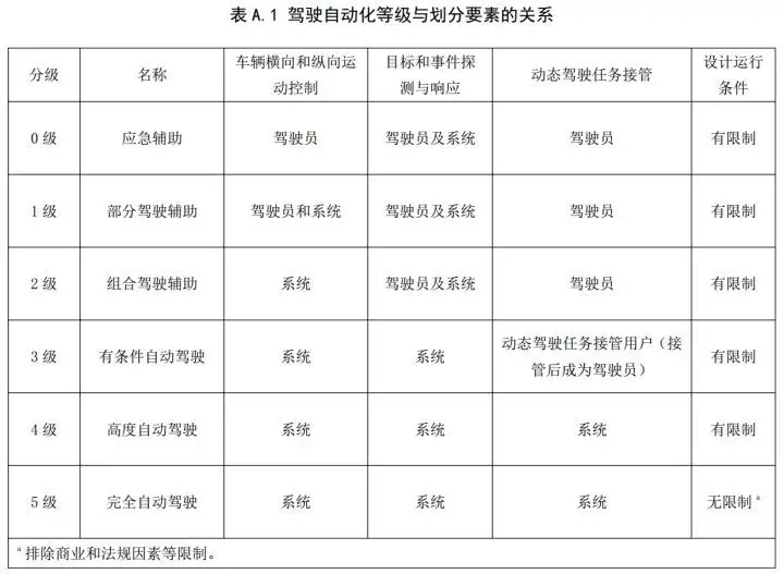 自动驾驶不是新能源汽车的专属技术,但是谈新能源汽车离不开自动驾驶。按照美国高速公路安全管理局(NHTSA)和美国汽车工程师学会(SAE)提出的分级标准,自动驾驶可分为L0、L1、L2、L3、L4、L5六个等级。中国工信部发布的《汽车驾驶自动化分级》,也把自动驾驶分为0级到5级共六级,与NHTSA/SAE的划分标准基本一致。《汽车驾驶自动化分级》的划分标准如下: