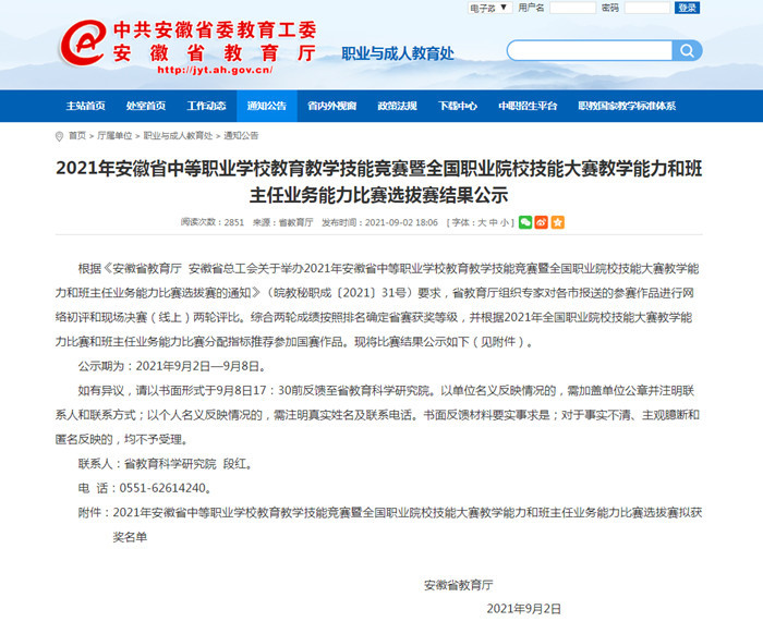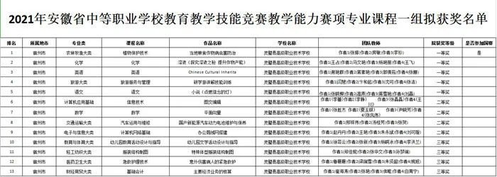 2021年安徽省中等职业学校教育教学技能竞赛由安徽省教育厅、安徽省总工会主办,安徽省教育科学研究院、安徽开放大学承办,是安徽省一类赛事。在本次大赛中,全省16个市共上报教师教学能力和班主任业务能力两类赛项共383件作品,其中教学能力比赛作品有德育等10门公共基础课程和16个专业类别的专业课程共354件。安徽省教育厅组织专家对各市报送的参赛作品进行网络初评和现场决赛(线上)两轮评比,共评选出一等奖36个,二等奖74个,三等奖112个。