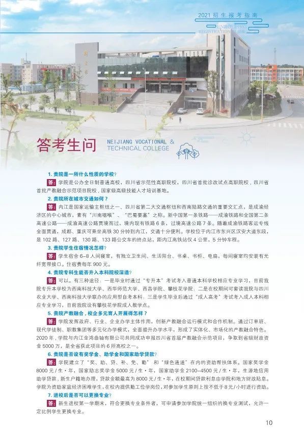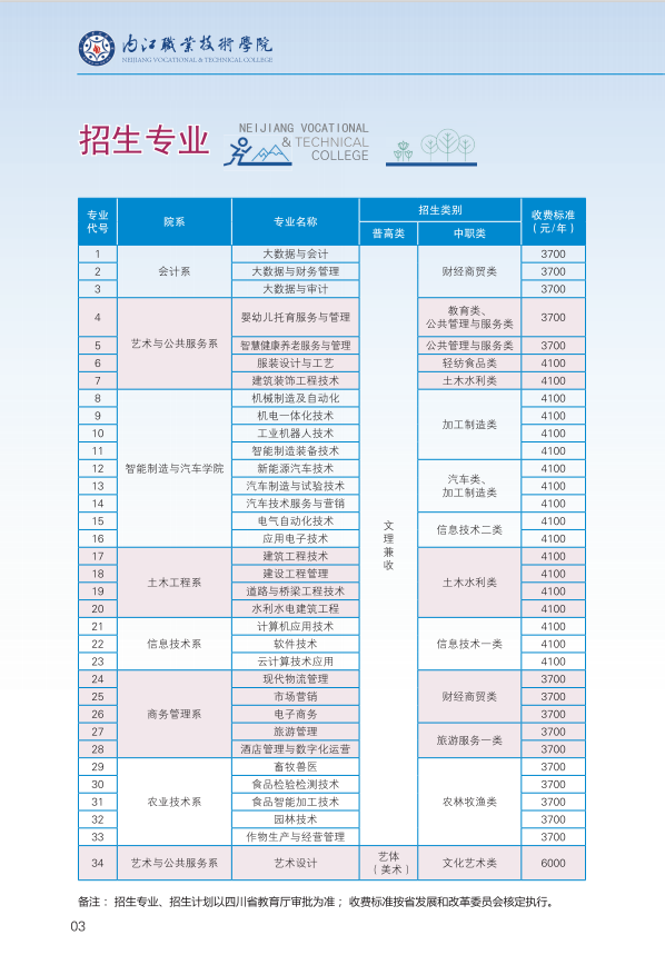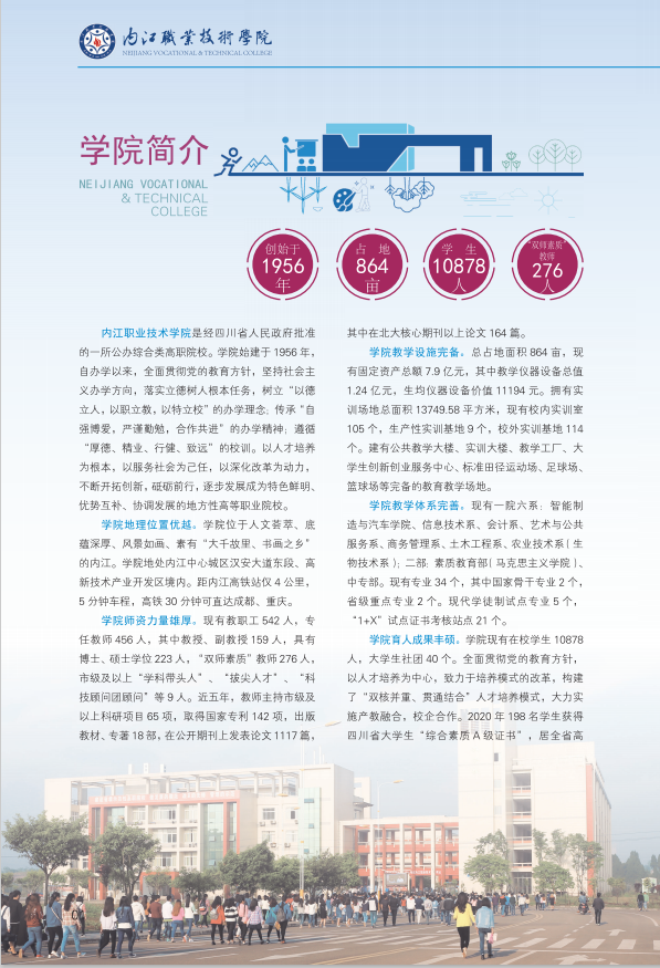 内江职业技术学校是经四川省人民政府批准的一所公办综合类高职院校。学校始建于1956年,自办学以来,全面贯彻党的教育方针,坚持社会主义办学方向,落实立德树人根本任务,树立“以德立人,以职立教,以特立校”的办学理念;传承“自强博爱,严谨勤勉,合作共进”的办学精神;遵循“厚德、精业、行健、致远”的校训。以人才培养为根本,以服务社会为己任,以深化改革为动力,不断开拓创新,砥砺前行,逐步发展成为特色鲜明、优势互补、协调发展的地方性高等职业院校。