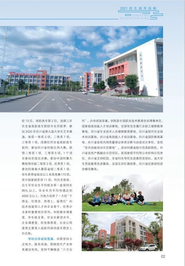 学校育人成果丰硕。学校现有在校学生10878人,大学生社团40个。全面贯彻党的教育方针,以人才培养为中心,致力于培养模式的改革,构建了“双核并重、贯通结合”人才培养模式,大力实施产教融合,校企合作。2020年198名学生获得四川省大学生“综合素质A级证书”,居全省高校13位,高职高专第2位,连续三年在全省高职高专院校中名列前茅;参加2020年四川省第九届大学生艺术展演,荣获一等奖3项,二等奖7项,三等奖1项,成绩位列全省高职高专前列;参加四川省创新应用大赛,获得二等奖1项、三等奖5项,1个项目参加全国总决赛,参加中国创翼大赛取得市级二等奖2项、优秀奖1项,参加创青春大赛获省级二等奖1项;学生获得省级及以上各类竞赛173项,其中国家级奖项11项,创历史新高;近5年毕业生平均就业率一直保持在95%以上,毕业生月平均待遇达到4000元以上;为地方培养了一大批“下得去、吃得苦、用得上、留得住”的技术技能型人才和企业骨干、优秀企业家和重要岗位领导。学校教学满意度、学生就业率、毕业生薪资水平、企业满意度、校友推荐度、社会认同度等主要育人指标均保持逐年稳步上升态势。