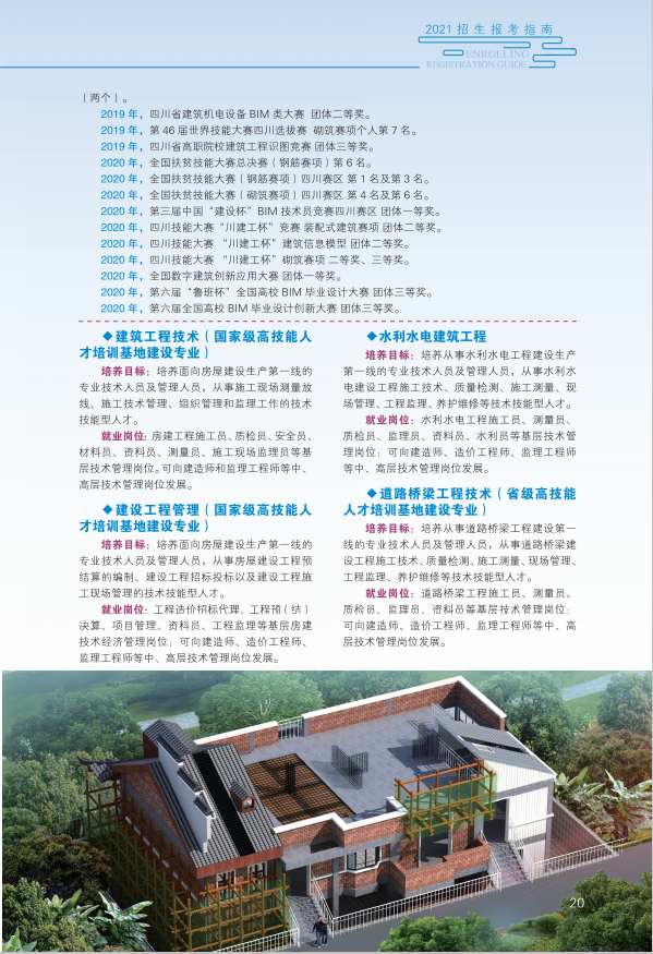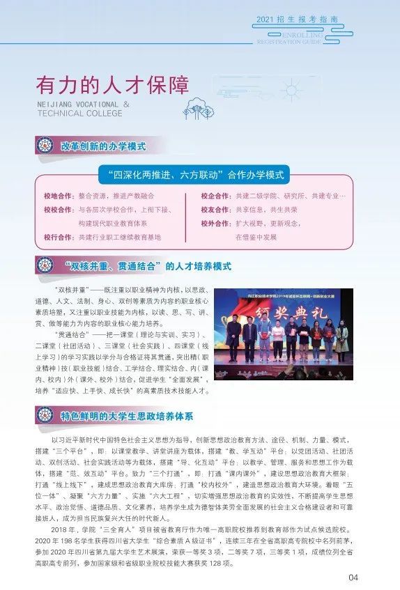 2018年, 学校“三全育人”项目被省教育厅作为唯一高职院校推荐到教育部作为试点候选院校。2020年198名学生获得四川省大学生“综合素质A级证书”,连续三年在全省高职高专院校中名列前茅,参加2020年四川省第九届大学生艺术展演,荣获一等奖3项,二等奖7项,三等奖1项,成绩位列全省高职高专前列,参加国家级和省级职业院校技能大赛获奖128项。