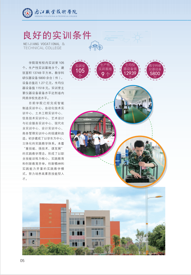 目前学校已经完成智能制造实训中心、自动化技术实训中心、土木工程实训中心、信息技术实训中心、艺术设计与社会服务实训中心、现代农业实训中心、会计实训中心、商务管理实训中心的组建和改造,初步建成了以学生为中心、立体化的实践教学体系。本着“重技能、强技术、谋发展”的实践教学理念,形成了以职业技能训练为核心,实践教育和创新教育并举,创新精神和实践能力并重的实践教学模式,努力培养高素质技能型人才。