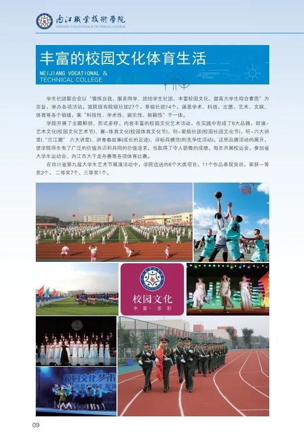 学校开展了主题鲜明、形式多样、内容丰富的校园文化艺术活动,在实践中形成了6大品牌,即演-艺术文化(校园文化艺术节)、赛-体育文化(校园体育文化节)、创-星级社团(校园社团文化节)、听-六大讲堂(“沱江潮” 六大讲堂)、讲青春故事(成长的足迹)、评标兵模范(创先争优活动)。这些品牌活动的展开,使学校师生有了广泛的价值共识和共同的价值追求,也取得了令人骄傲的成绩。每年开展校运会,参加省大学生运动会、内江市大干龙舟赛等各项体育比赛。