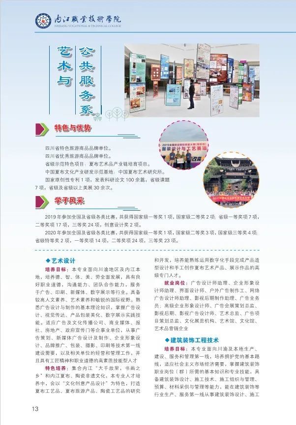 特色培养:集合内江“大千故里,书画之乡”和内江夏布、陶瓷非遗文化,本专业人才培养中,会以“文化创意产品设计”为特色,打造夏布工艺品、夏布旅游产品、陶瓷工艺品的研究和开发,培养能熟练运用数字化手段完成产品造型设计和手工创作夏布艺术产品、展示作品的高级专门人才。
