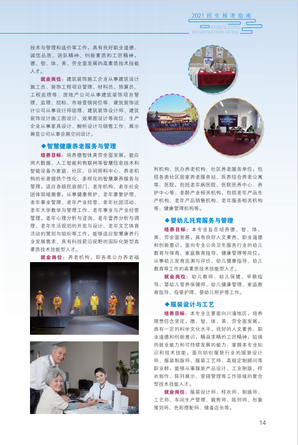 培养目标:本专业面向川渝及本地生产、建设、服务和管理第一线,培养拥护党的基本路线,适应社会主义市场经济需要,掌握建筑装饰职业岗位(群)所需的基本知识和专业技能,具备建筑装饰设计、施工技术、施工组织与管理、预算、材料采供与管理等能力,能在建筑装饰等行业生产、服务第一线从事建筑装饰设计、施工技术与管理和造价等工作,具有良好职业道德、诚信品质、团队精神、创新素质和工匠精神,德、智、体、美、劳全面发展的高素质技术技能人才。
