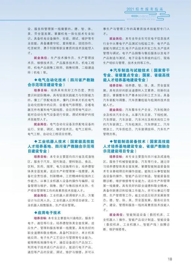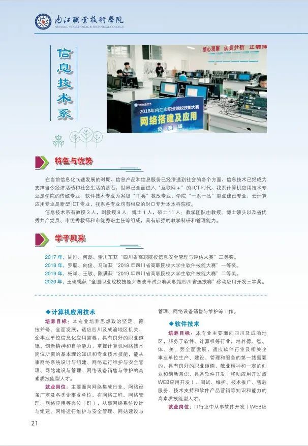 培养目标:本专业培养思想政治坚定、德技并修、全面发展,适应四川及成渝地区机关、企事业单位信息化应用需要,具有良好的职业道德、创新精神和自学能力,掌握计算机网络技术岗位所需的基本理论知识和专业技术技能,能从事网络系统设计与组建、网络运行维护与安全管理、网站建设与管理、网络设备销售与维护的高素质技能型人才。