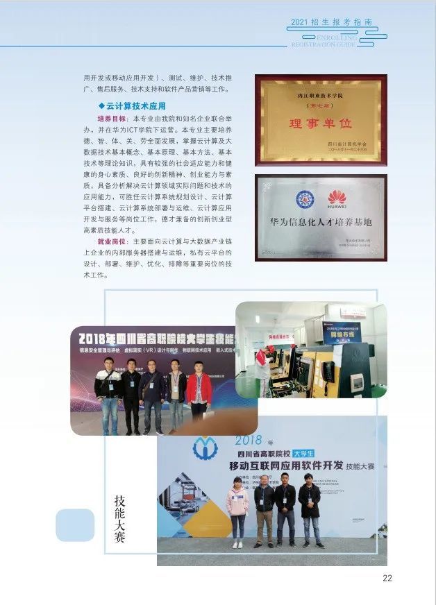 培养目标:本专业由我院和知名企业联合举办,并在华为ICT学校下运营。本专业主要培养德、智、体、美、劳全面发展,掌握云计算及大数据技术基本概念、基本原理、基本方法、基本技术等理论知识,具有较强的社会适应能力和健康的身心素质、良好的创新精神、创业能力与素质,具备分析解决云计算领域实际问题和技术的应用能力,可胜任云计算系统规划设计、云计算平台搭建、云计算系统部署与运维、云计算应用开发与服务等岗位工作,德才兼备的创新创业型高素质技能人才。