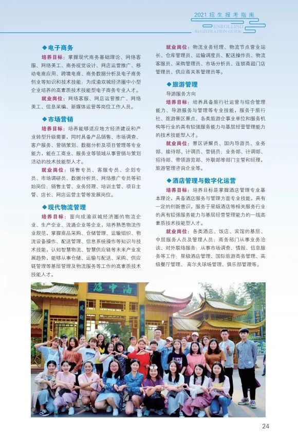 培养目标:掌握现代商务基础理论、网络客服、网络美工、商务视觉设计、网店运营推广、移动电商应用、跨境电商、商务数据分析及电子商务创业等知识和技术技能;为成渝双城经济圈中小型企业培养的高素质技术技能型电子商务专业人才。