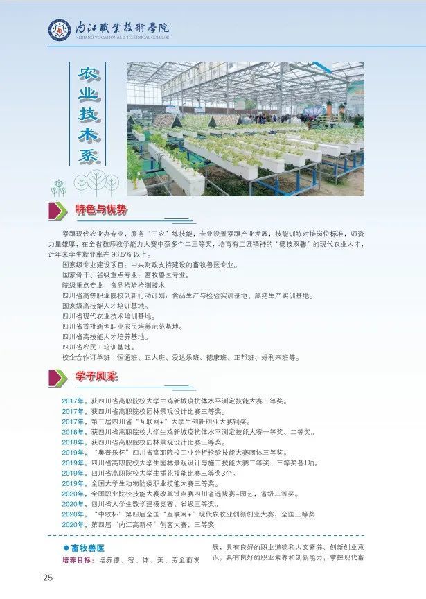 培养目标:培养德、智、体、美、劳全面发展,具有良好的职业道德和人文素养、创新创业意识,具有良好的职业素养和创新能力,掌握现代畜禽养殖的基本知识和健康养殖技术,具备畜禽饲养管理、畜禽主要疾病的预防及诊疗能力的技术技能人才。