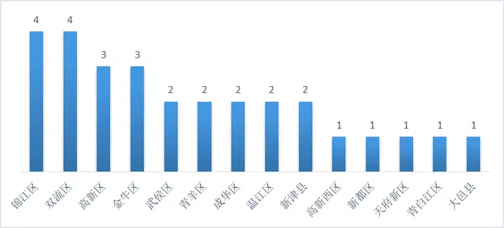 锦江、双流区国际学校最多,各4所国际学校。其次高新区、金牛区有3所。武侯区、青羊区、成华区等只有2所国际学校。离市区较远的高新西区、新都区、天府新区等,只有1所国际学校(注:一所国际学校内可能有多个国际项目)。