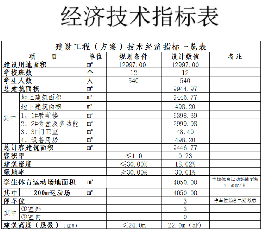项目(一期)占地面积12977㎡,容积率18.02%,绿地率30.01%。其中总建筑面积9944.97㎡,包含教学楼、食堂和多功能室、门卫室、设备房等多种用途规划。