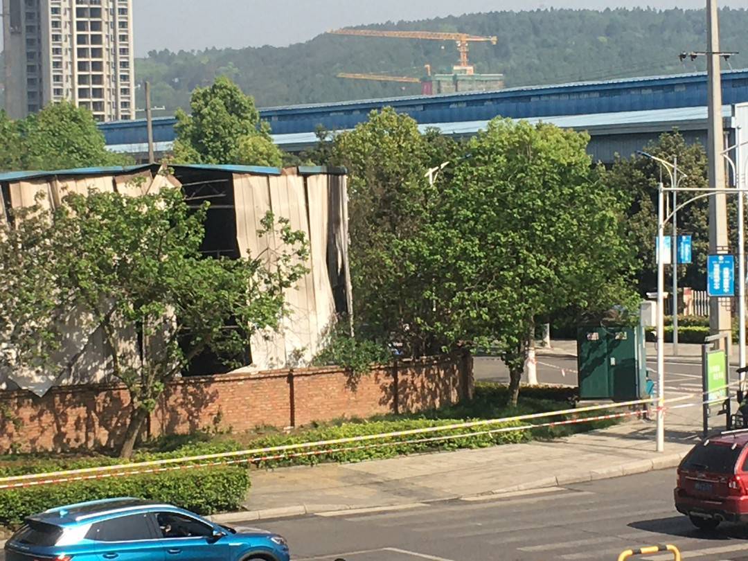 站在路边可以看到,搭建在围墙内的彩钢棚上面,有明显被烟熏过的痕迹,有部分作为墙壁的彩钢已被烧透,裸露出里面的钢架。据绵阳消防通报,本次火灾过火面积约600平方米。