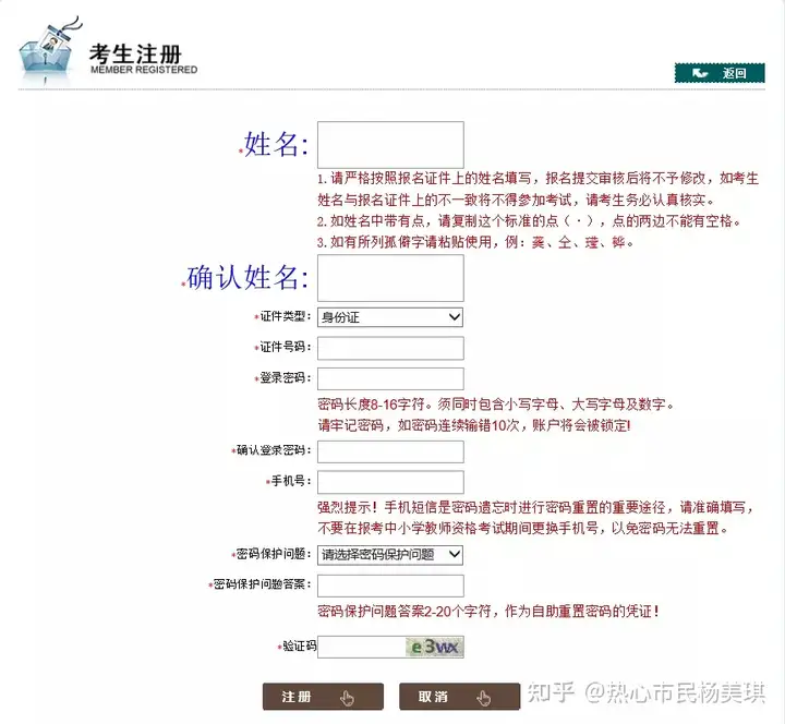 填写姓名,和身份证保持一致。证件类型一般是身份证,然后设置密码、确认密码。填写手机号,手机号可以找回密码,建议资格证考试这段时间不要更换号码。然后设置密码保护问题及答案,输入验证码后点击“注册”即可。