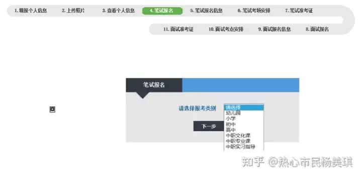 ①选择考试类别:可选的考试类别有幼儿园、小学、初中、高中、中职文化课、中职专业课、中职实习指导。