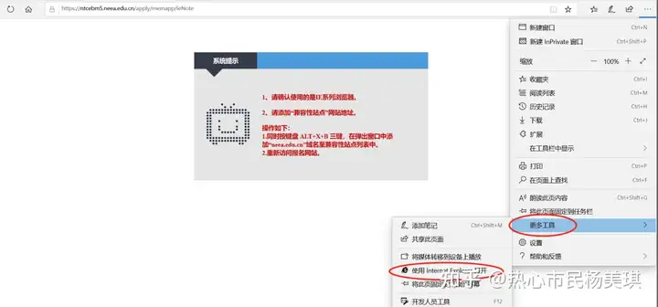 第二步:然后再打开这个Edge浏览器的条件下,同时按键ALT+X两键操作。第三步:点击弹出菜单的【更多工具】按钮、选择【使用internet explorer打开】