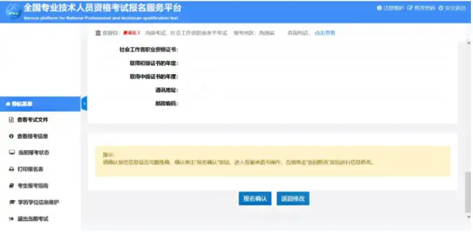 个人基本信息不再这里展示,主要列举重点的信息,提醒考生注意!我们以报考助理社会工作师,高中学历为例。