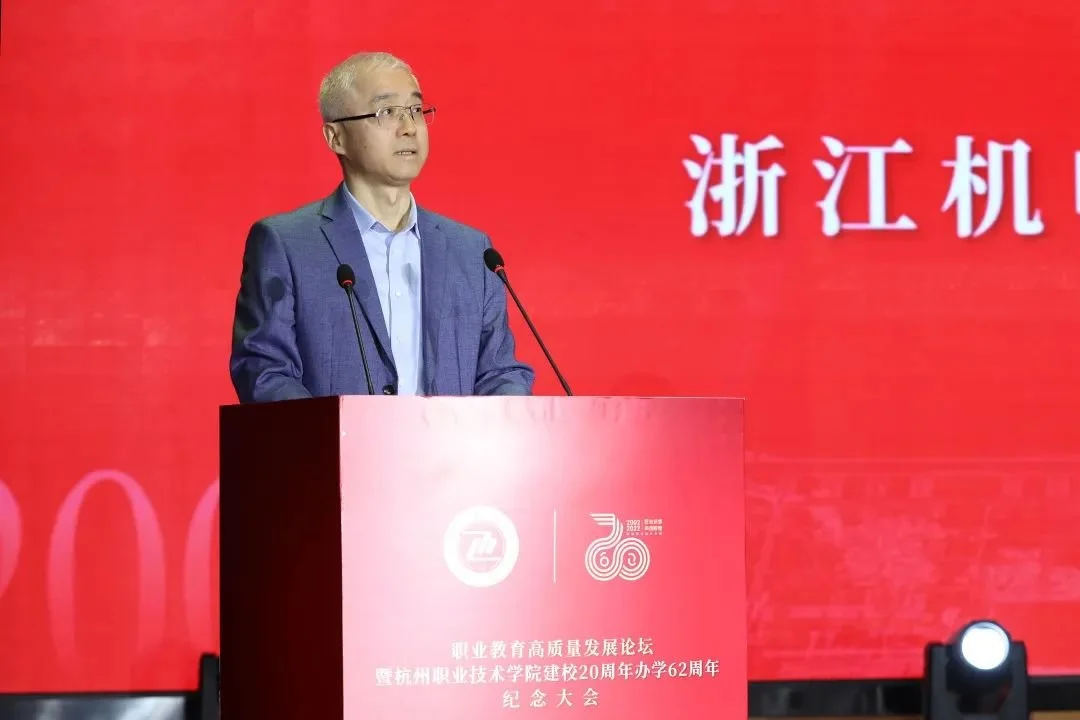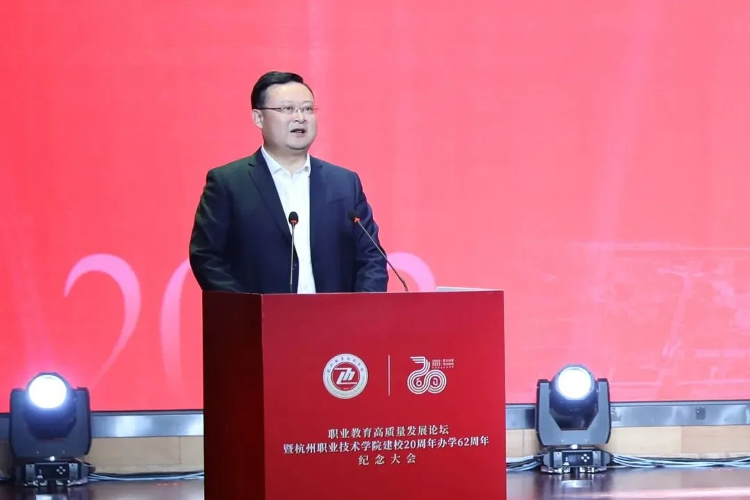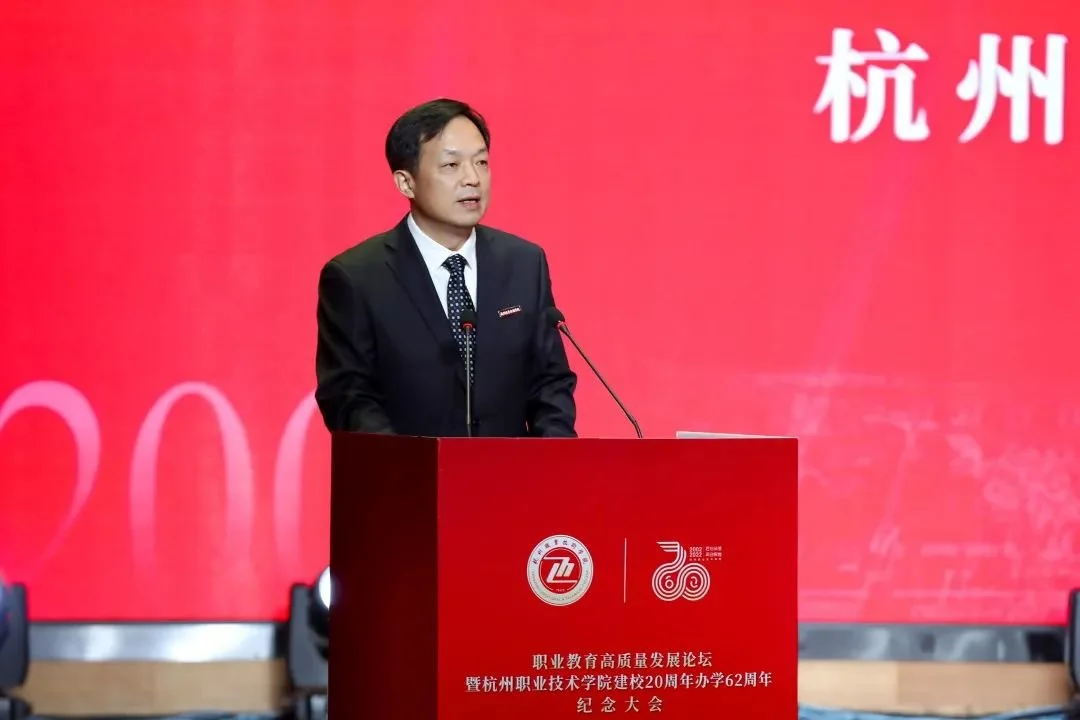 杭职院党委书记金波在致辞时感慨地说,建校20年以来,杭职院因“杭”而生、始终与杭州发展同频共振,锚“职”发展、探索职教改革的“杭职路径”,以质立“院”、高质量发展赋能中国式现代化建设。他表示,面对职业教育大改革大发展的历史机遇,杭职院将准确识变、科学应变、主动求变、创新引变;以更大的勇气智慧,把握规律,攻坚克难;以更高的发展水平,提升形象,担当使命。以建校20周年办学62周年纪念大会为契机,秉承前志、担当奋进,以更加高远的追求、更加昂扬的精神、更加奋进的姿态,在内涵发展、特色办学的道路上迈出更加坚实的步伐,奋力建设国内一流、国际上有较大影响力的“高职名校”,以优异的发展成绩践行党的二十大精神,在全面建设社会主义现代化国家、实现第二个百年奋斗目标、以中国式现代化全面推进中华民族伟大复兴的伟大征程中展示杭州职教风采!