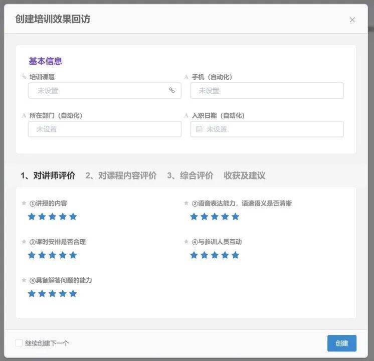 用于公司培训的发起和效果回访。发起培训可以关联讲师和学员,完成后系统将会自动向学员发送调研,评价本次培训效果。