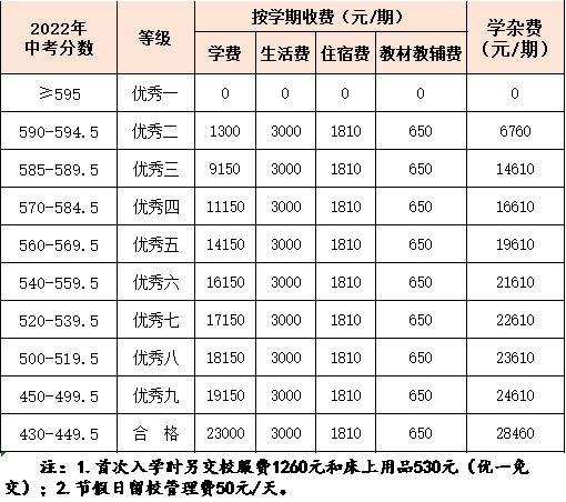 A9:学校收费严格执行教育局和发展局审批的标准,根据2022年中考成绩按等级缴费。学校收费有严格的管理制度,所有收费公开、透明,严禁教师接受家长宴请和送礼,严禁教师私下收取任何费用,严禁教师进行有偿补课。2022年秋期高一年级具体收费标准如下( 中考志愿纯报毕节东辰且被我校录取的学生享受此收费标准):