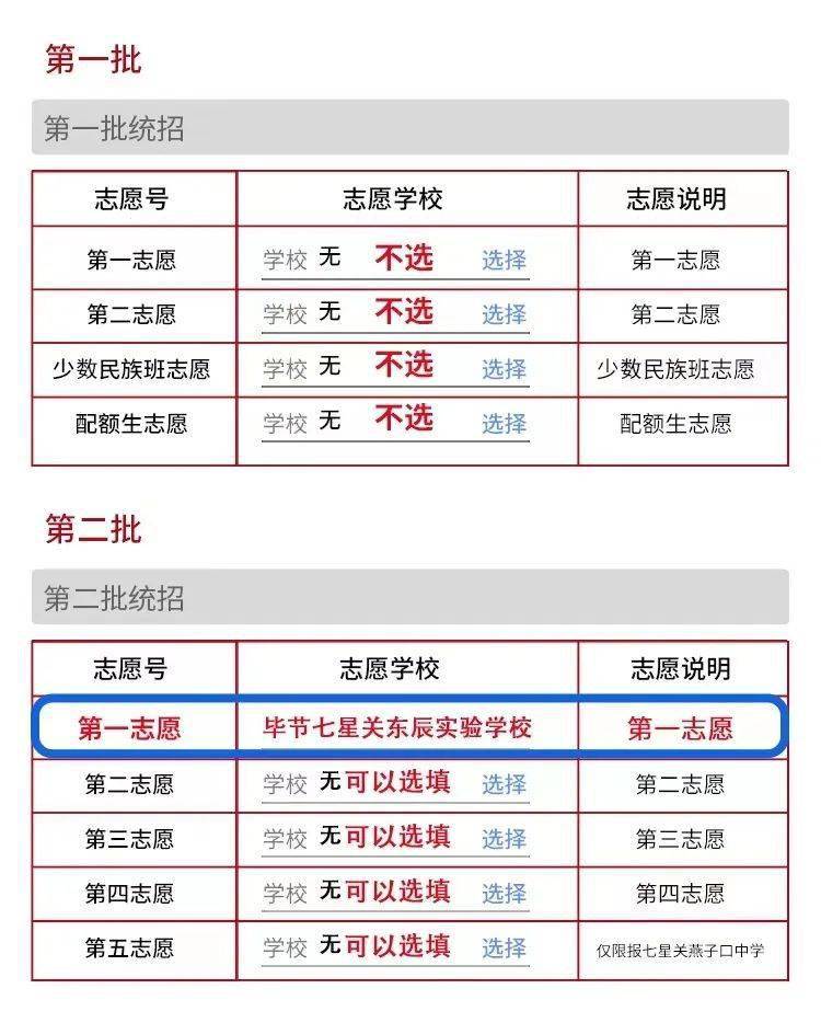 A6:若确定就读我校,只需在中考志愿填报系统“第二批次第一志愿”中选择“毕节七星关东辰实验学校”即可,建议第一批次和第二批次的其他志愿都不填写,以免被其他学校录取后无法到毕节东辰就读。