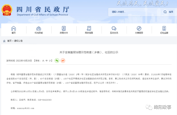 日前,四川省民政厅发布关于全省基层治理示范街道(乡镇)、社区的公示。绵阳2街道(乡镇)7社区拟入选省级示范,有你家所在的街道(乡镇)或社区吗?