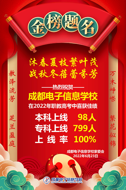 2022年成都电子信息学校在职教高考中喜获佳绩:本科上线98人,专科上线799人,上线率100%。本科上线总人数名列成都市第二名,会计事务专业本科上线人数名列四川省第一名,电子技术应用专业本科上线人数名列四川省第二名、成都市第一名。