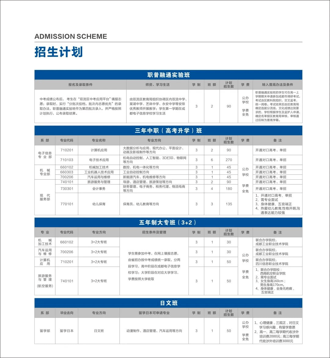 学校围绕电子技术应用、计算机应用、会计事务、幼儿保育、旅游服务与管理(含航空服务)、机械加工技术、汽车运用与维修、工业机器人技术应用8个专业开办了职普融通班、对口升学班、五年一贯制专业班(全日制3+2)、日文班。