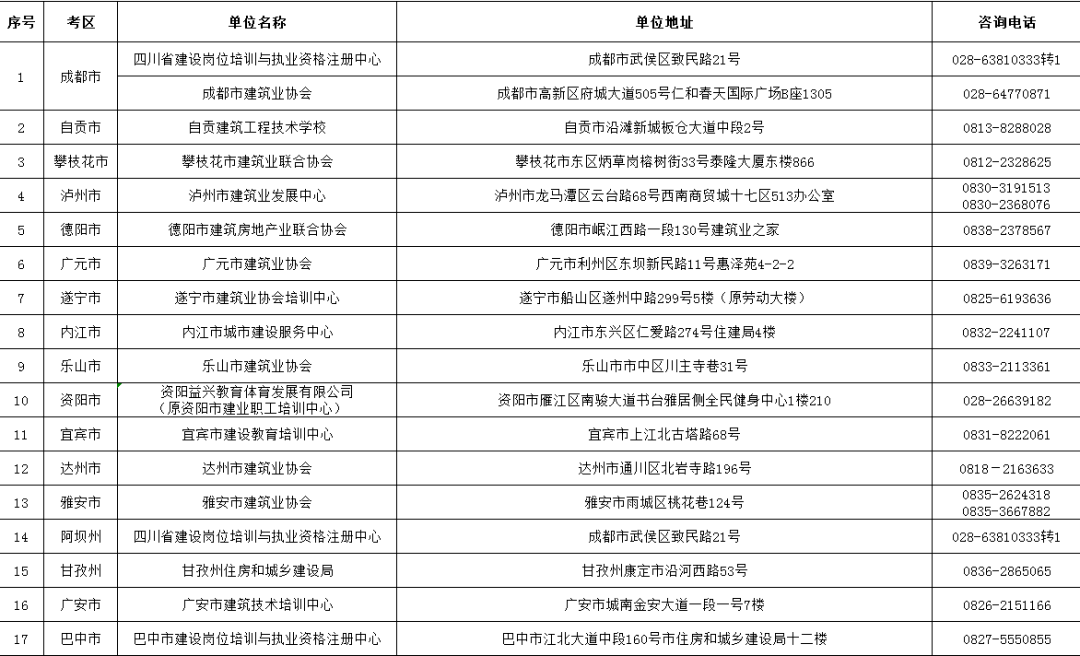 四川省建筑施工“安管人员”及“特种作业人员”考试报考资格核查机构信息表