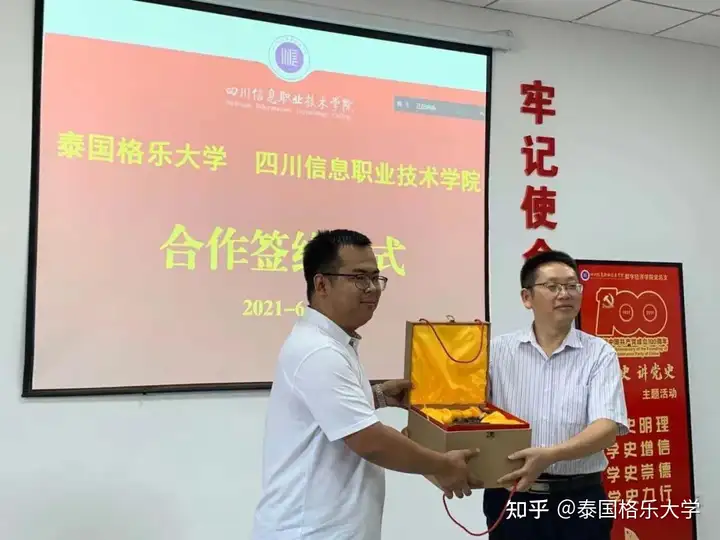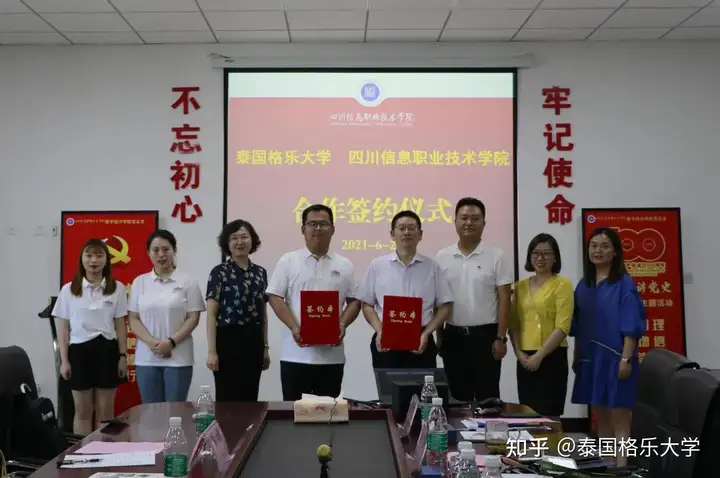 6月22日 ,泰国格乐大学与四川信息职业技术学校举行合作备忘录签约仪式。泰国格乐大学副校长素帕副教授携大学其他领导老师和四川信息职业技术学校韩鹏副校长、数字经济学校张健华书记、数字经济学校杜君副院长、外事办负责人唐妙荣主任、旅游管理专业教研室陈瑾主任共同出席本次会议。